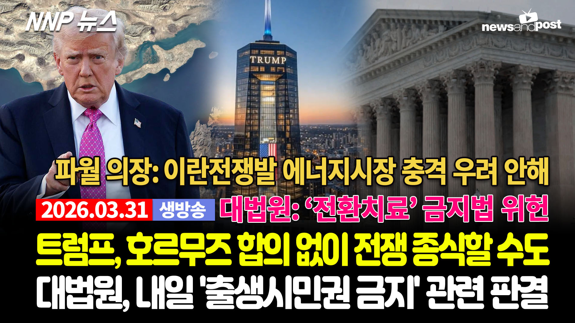 트럼프 “이란 새 정권 대통령, 휴전 원해” 도널드 트럼프 대통령은 1일(수) 오전 이란의 "새 정권 대통령"이 휴전을 요청해왔으며, 이는 "호르무즈 해협이 개방되고 자유롭고 안전할 때" 검토될 것이라고 밝혔다.트럼프 대통령은 이날 저녁 9시(동부표준시) 대국... | 1시간전 대법원, 수요일 '트럼프 출생시민권 금지' 명령 관련 판결 트럼프 대통령의 가장 야심찬 정책 중 하나인 출생시민권 정책 변경 노력이 수요일(4월 1일) 대법원에서 중대한 기로에 서게 될 예정이다.대법원이 그의 관세정책의 ... | 20시간전 트럼프, DHS 셧다운 해결 위해 의회 휴회 종료 강제 시사 도널드 트럼프 대통령은 31일(화) 국토안보부의 지속적인 셧다운 사태를 해결하기 위해 의회가 조기에 휴회에서 복귀하도록 요구할 의향이 있음을 시사했다.그는 뉴욕포... | 21시간전 대법원, 미성년자 ‘전환치료’ 금지법 위헌 판결 연방 대법원은 31일(화) 미성년자의 '성 정체성'을 생물학적 현실과 일치시키도록 치료사가 돕는 일명 '전환 치료'(Conversion Therapy)를 금지하는... | 21시간전 도널드 J. 트럼프 대통령 기념 도서관 이미지 첫 공개 플로리다주 마이애미에 건립 예정인 도널드 J. 트럼프 대통령 기념 도서관의 첫 번째 이미지가 30일(월) 공개됐다.트럼프 그룹의 부사장이자 대통령의 아들인 에릭 ... | 21시간전 |