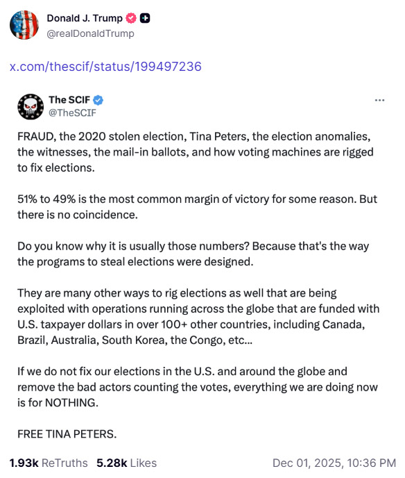 | 도널드 트럼프 대통령이 2020년 대선 부정선거 수사가 국내에 국한되지 않은 것임을 시사해 눈길을 끌고 있다. 여기에는 한국도 관련된 것으로 추정된다. 트럼프 대통령은 5일(목) 아침 워싱턴 힐튼 호텔에서 열린 국가조찬기도회에서 한 연설 중에 주요 각료들을 소개하면서, 툴시 개버드 국가정보국장(DNI)을 "국가 및 국제 정보국장(Director of National and International Intelligence)"이라고 칭했다. 개버드 국장의 관할이 국내에 뿐만 아니라 국제적인 것임을 확인한 것이다. 그러면서 트럼프 대통령은 조지아주 풀턴 카운티 선거 관리 센터 압수수색 당시에 개버드 국장이 현장에 갔던 것과 관련해 논란이 있었던 점에 대해 "그녀가 똑똑하기 때문에" 그곳에 갔던 것이라고 말했다. 그는 개버드 국장의 직위가 "국제적인 문제와 관련이 있다"고 밝히면서, 부정선거 수사와 관련해 러시아는 아무 문제가 없다고 확인하면서도 "하지만 거기에 중국과 약 다른 5개 국가를 추가할 수 있다(But you could add China and about five other countries to it)"고 말했다. 이는 2020년 미국 대통령 선거에 중국과 5개 나라가 개입했다는 것을 의미하는 것이어서 주목된다. 사실 이 발언의 문맥상 의미는 "외국의 선거개입에 대해 이야기할 거라면 러시아만 콕 집어 말하지 말고 중국과 다른 나라들도 함께 언급해야 한다"로 풀이될 수 있다. 그러나 개버드 국장의 업무가 국제적인 문제와 관련돼 있다고 지적한 점과 그녀가 조지아주 압수수색 현장에 나타난 점이 함께 언급된 점을 감안하면 해석이 달라질 수 있다. 트럼프 대통령은 이날 5개 국가가 어디인지는 밝히지 않았지만, 앞서 지난해 12월 1일 트럼프 대통령은 트루스소셜에 The SCIF 엑스 계정 게시물을 공유했는데, 해당 게시물에는 한국이 언급돼 눈길을 끈 바 있다. ![]() 그 게시물에는 "선거 조작을 위한 다른 수많은 방법들도 존재하며, 이는 전 세계적으로 운영되는 작전을 통해 악용되고 있다. 이러한 작전은 캐나다, 브라질, 호주, 한국, 콩고 등 100여 개국이 넘는 국가에서 미국 납세자들의 세금으로 자금을 지원받고 있다."라고 씌여있다. 그러면서 "미국과 전 세계의 선거를 바로잡고 투표를 집계하는 악의적인 행위자들을 제거하지 않는다면, 지금 우리가 하는 모든 일은 아무 의미도 없다"고 강조했다. SCIF의 게시물은 티나 피터스(Tina Peters)를 석방하라는 내용의 글이었는데, 그녀가 2020년 '도둑맞은 선거'에서 투표기계들이 어떻게 선거를 조작했는지에 대한 증인이라고 주장했다. 티나 피터스(Tina Peters)는 콜로라도주 메사 카운티 서기(Clerk)로 2019년 취임했지만 2020년 대선 이후 도미니언 투표 시스템의 문제점을 공개적으로 제기했다가 2022년 기소돼 유죄 판결을 받고 9년형을 선고받아 현재 수감 중이다. 이 게시물이 올려졌던 당시에는 뉴스맥스와 원어메리카뉴스(OANN)에서 백악관 특파원을 지낸 에머럴드 로빈슨(Emerald Robinson)이 일련의 엑스 게시글을 통해 삼총사(패트릭 번, 개리 번슨, 일론 머스크)가 2024년 선거를 구했다고 폭로했던 때였다. 이는 트럼프 대통령이 앞서 11월 23일(일) 밤 트루스소셜에 "우리는 모든 에너지와 힘을 선거 사기에 집중해야 한다!!!"라는 글을 올리면서 개리 번슨이 출연한 라라 로건의 팟캐스트를 공유한지 일주일 만에 나왔다. 이와 관련해 한국에서는 USAID로부터 자금을 지원받은 A-WEB이 전 세계에 부정선거 시스템을 보급했다는 주장이 널리 확산하고 있다. 홍성구 기자 |