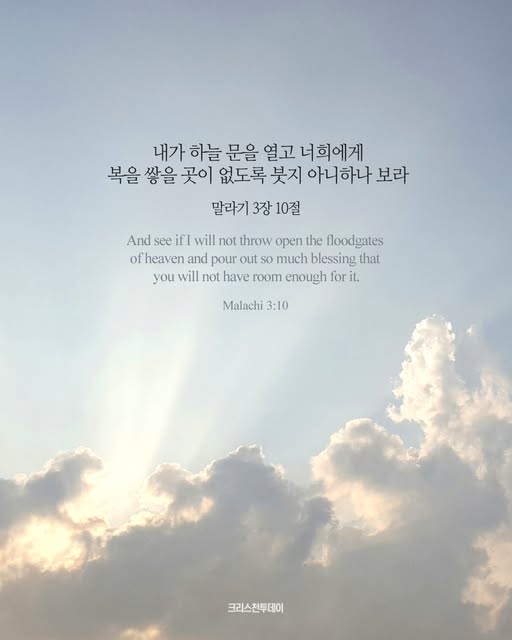 | 만군의 여호와가 이르노라 너희의 온전한 십일조를 창고에 들여 나의 집에 양식이 있게 하고 그것으로 나를 시험하여 내가 하늘 문을 열고 너희에게 복을 쌓을 곳이 없도록 붓지 아니하나 보라 만군의 여호와가 이르노라 내가 너희를 위하여 메뚜기를 금하여 너희 토지 소산을 먹어 없애지 못하게 하며 너희 밭의 포도나무 열매가 기한 전에 떨어지지 않게 하리니 너희 땅이 아름다워지므로 모든 이방인들이 너희를 복되다 하리라 만군의 여호와의 말이니라 (말라기3:10~12) 아멘. |