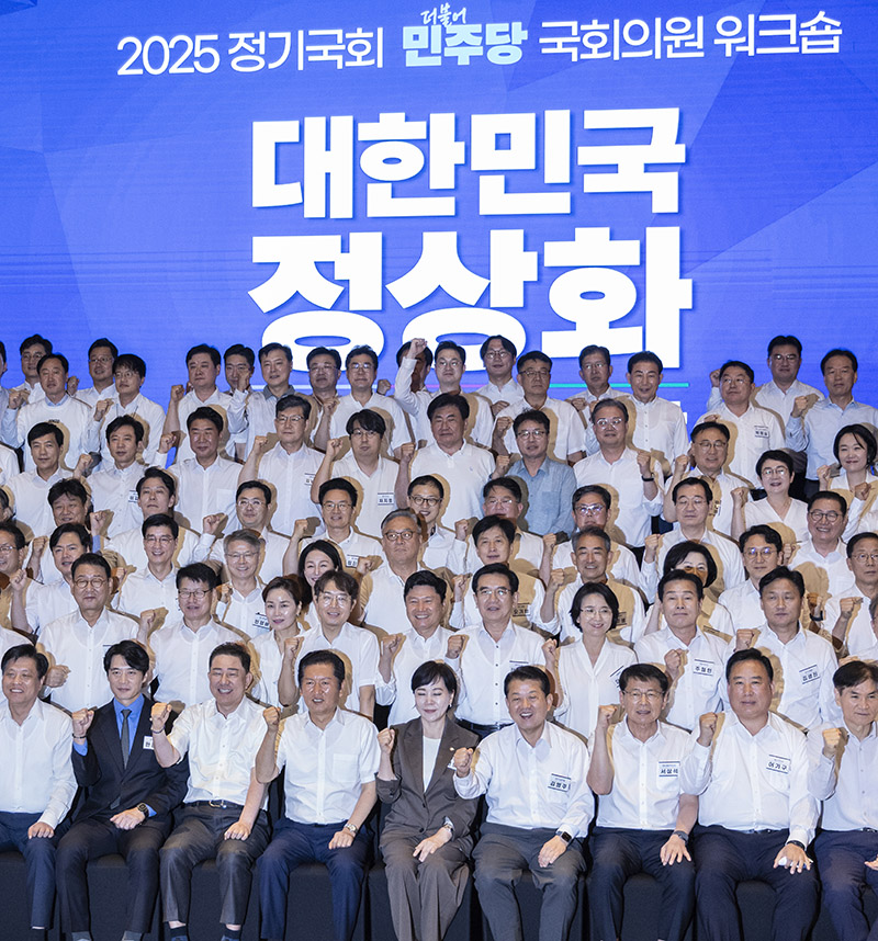 | ▲28일 인천시 중구 파라다이스시티 컨벤션에서 열린 더불어민주당 의원단 워크숍에서 정청래 대표와 김병기 원내대표를 비롯한 의원들이 기념 촬영 도중 구호를 외치고 있다. 2025.8.28 [연합뉴스] |