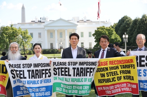 백악관 앞에서 시위 나선 포항시장…"철강관세 인하하라"