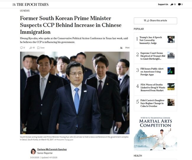CPAC 참석 중 외신 인터뷰… 에포크타임스 보도문재인·이재명 등 좌익, 中 이민자 대거 입국 허용