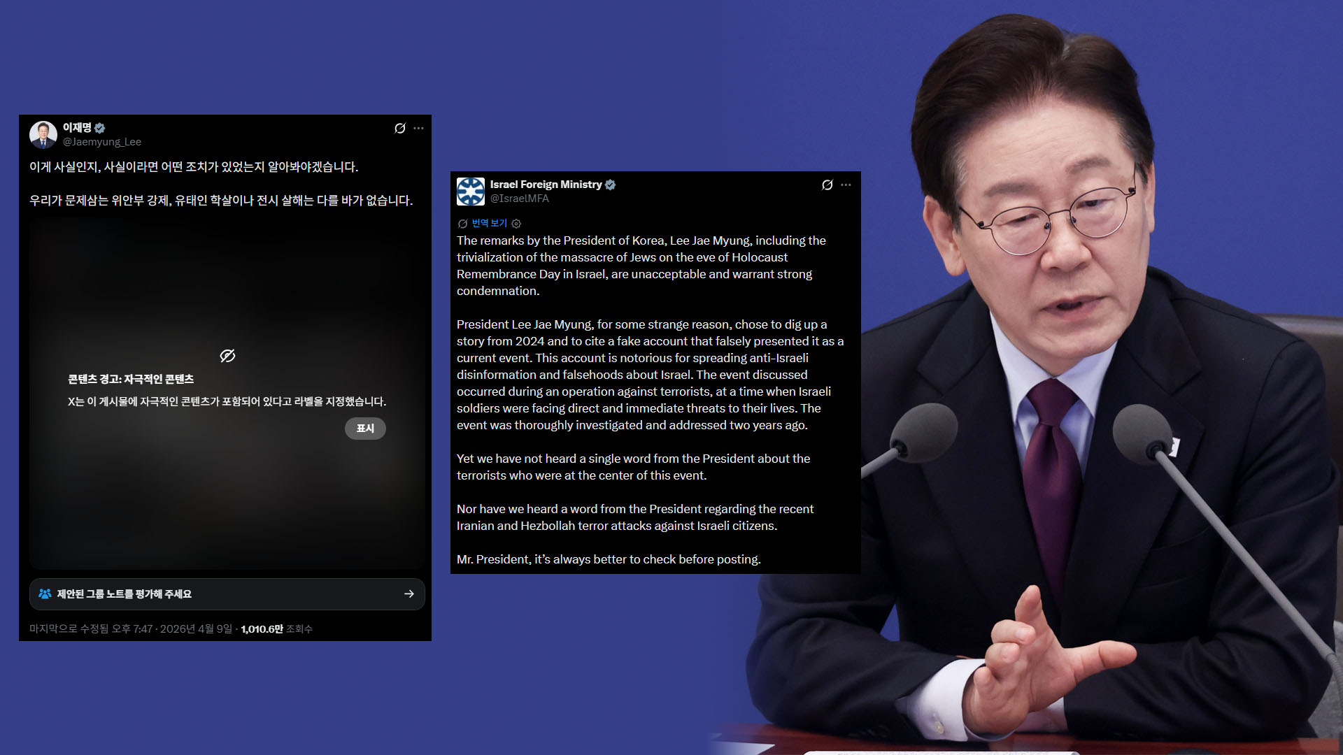 이스라엘 외교부 비판에 이 대통령 “실망스럽다” 맞대응“보편적 인권 언급하지만 ‘편향적’ 발언했다” 잇달아
