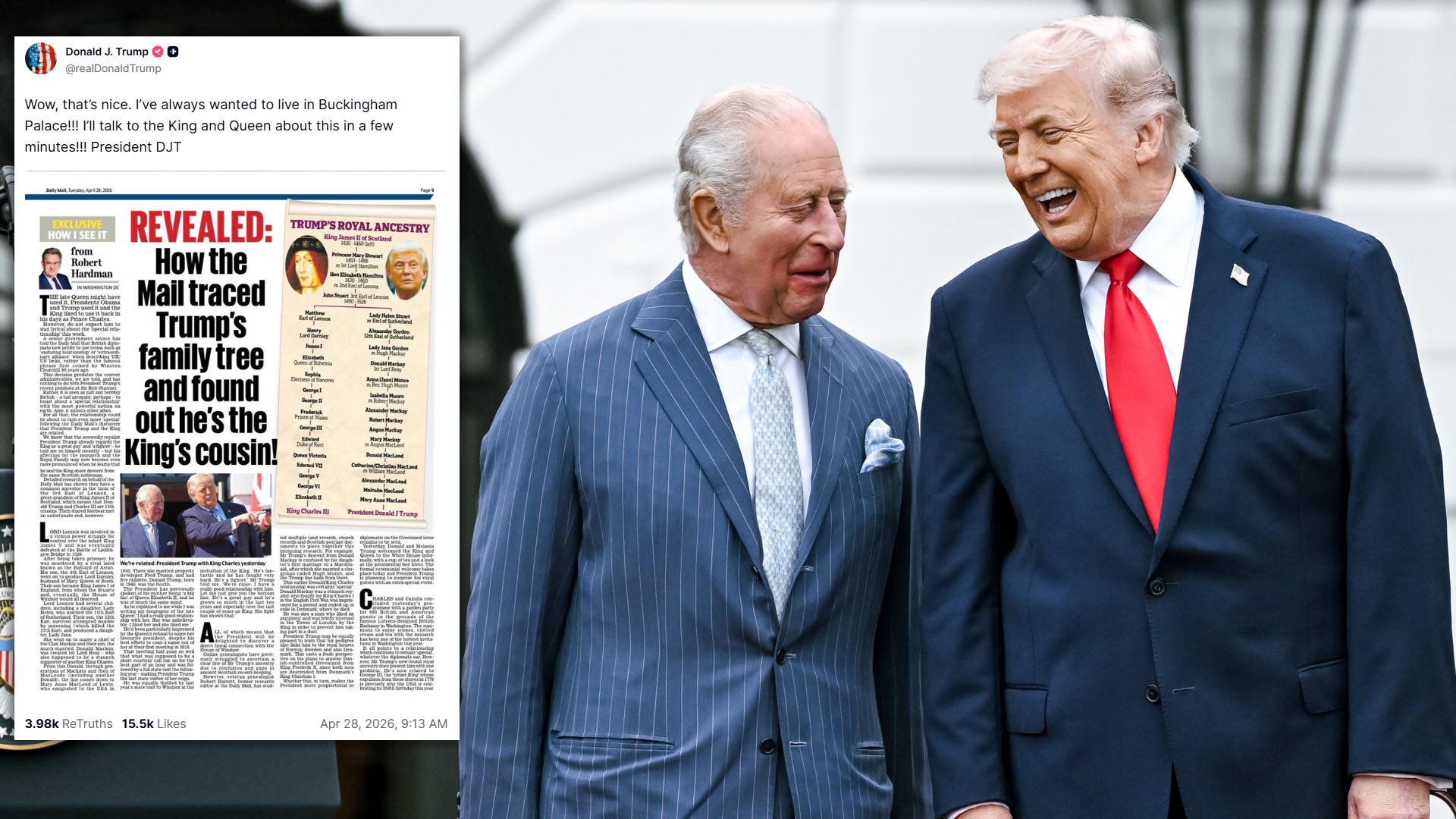 찰스 3세 국왕, 의회 연설에서 미국과 영국 간 단결 촉구 찰스 3세 국왕은 28일(화) 미국 의회 합동 회의에서 역사적인 연설을 통해 영국과 미국의 수백 년에 걸친 관계를 칭송했으며, 이는 미국의 건국 250주년 기념 방문의 일환이었다. | 정치/경제 | 12시간전 데일리메일 “트럼프와 찰스 국왕은 15촌 사촌” 트럼프 “난 항상 버킹엄 궁전에 살고 싶었다”도널드 트럼프 대통령이 28일(수) 찰스 3세 영국 국왕과 먼 친척일 수 있다는 기사를 트루스소셜에 공유하면서, "와, 멋지다. 나는 항상 버킹엄 궁전에서 살고 싶었다!!!"고 밝혔다.그는 데일리메... | 14시간전 트럼프: 이란은 '붕괴 상태'에 있다 도널드 트럼프 대통령은 28일(화) 이란이 "붕괴 직전의 상태"에 있다는 신호를 보냈다고 말했다.트럼프 대통령은 트루스소셜에 올린 글에서 이란 관리들이 구제를 요청하며, 특히 중요한 국제 해상 운송... | 14시간전 암살 시도 사건 여파? … 백악관 연회장 건설 재개 추진 랜드 폴 상원의원 관련 법안 발의도널드 트럼프 행정부가 추진 중인 백악관 연회장 건설 사업이 지난 주말 발생한 총격 사건을 계기로 공사가 재개될 전망이다.트럼프 대통령은 소셜미디어를 통해 "백악관 내부에 연회장이 있었다면 이번 총... | 13시간전 |